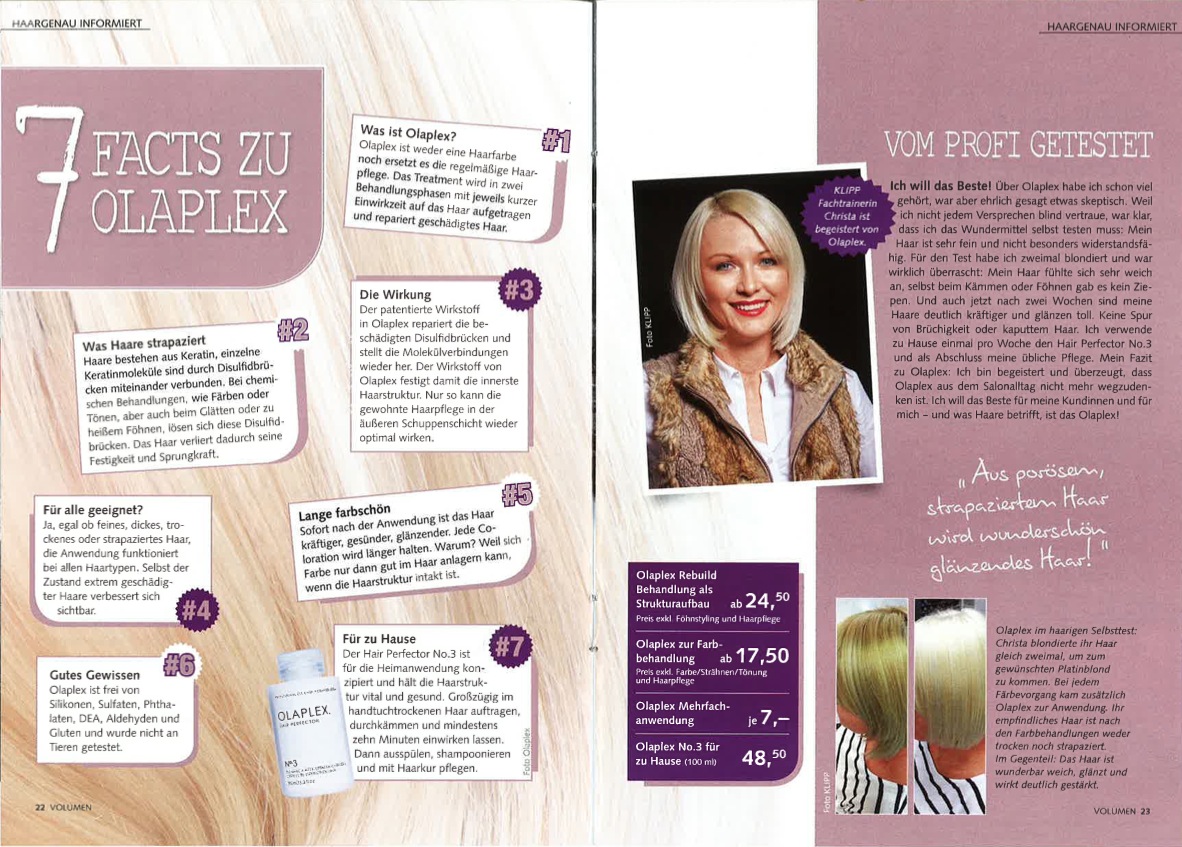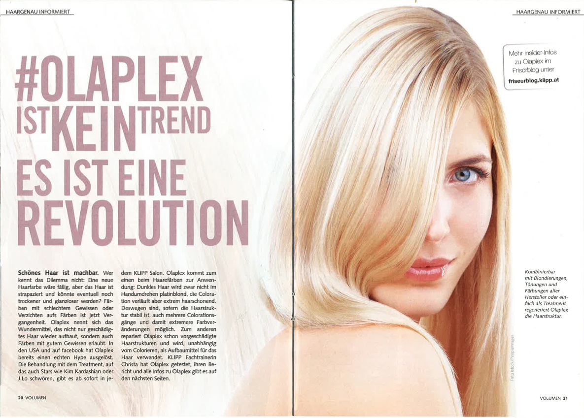 Hair Artists und ihre Kunden können aufatmen, denn geschädigtes Haar war einmal! Kombinierbar mit Blondierungen, Tönungen und Färbungen aller Hersteller oder einfach als Treatment, agiert die Drei-Stufen-Behandlung Olaplex® als Bindungsverstärker und regeneriert die beim Färben oder im Alltag beschädigte Haarstruktur dauerhaft.